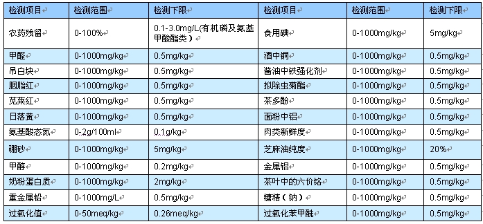 多功能食品**检测仪可快速定量检测食品中农药残留、甲醛、二氧化硫、亚硝酸盐、硝酸盐、双氧水、吊白块、酱油氨基酸态氮、糖精(钠)、硼砂、甲醇、奶粉蛋白质、过氧化苯甲酰、拟除虫菊酯、茶多酚、面粉中铝、食用合成色素—胭脂红、苋菜红、日落黄、肉类新鲜度、组胺、挥发性盐基氮、过氧化值、重金属铅、锌、铝、铁、铜、砷、汞、铬、锰、茶叶中的六价铬、食用碘、酒中铜、酱油中铁强化剂、芝麻油纯度、猪油丙二醛、蜂蜜中蔗糖、盐基氮等多个项目。可从以上项目中选择N项,组成N合1食品检测仪。适用于各级农业检测中心、生产基地、农贸市场、超市、卫生、环保、宾馆酒店等领域。