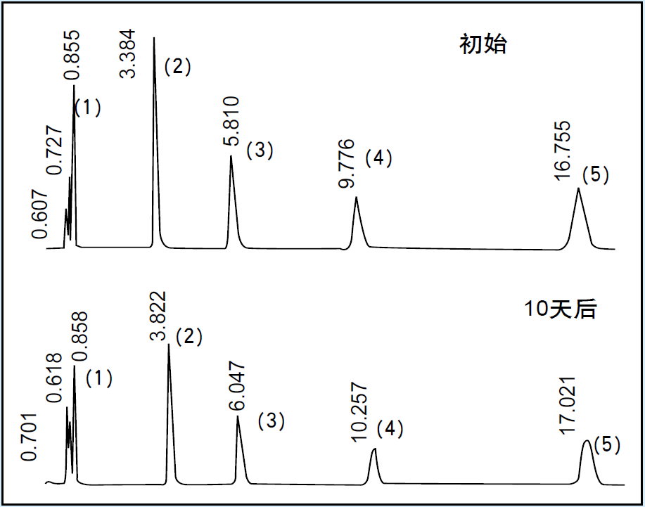 样 品:(1) 尿嘧啶、(2) 多虑平、(3) 去甲替林、(4) 阿米替林、(5) 三甲丙咪嗪