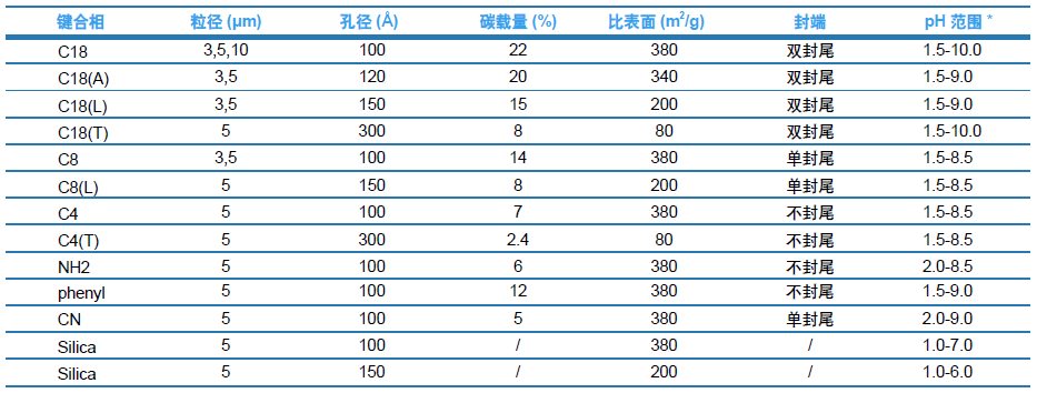备注*:为了获得更佳的寿命和效果建议在*佳适用pH 范围使用: Silica *佳适用范围为2.0-5.0; 其他键合相的*佳适用范围为2.0-6.0