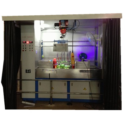 CDG-4000荧光磁粉探伤检测机系机电半组合式半自动荧光磁粉探伤设备,由电源控制系统、夹持磁化装置、荧光观察检查装置、退磁装置等几大部分组成,适用于以湿式磁粉法检测由铁磁性材料制成的各类阀门件的表面及近表面因材料、锻压、铸造、淬火、加工、疲劳等各种原因引起的裂纹和各种细微缺陷。1.3、本设备采用手动、自动两种运行方式,由可编程控制器(PLC)集中控制。手动时,可进行每个功能的单步独立操作;自动时,设备自动执行PLC内部程序,上料到位后→电极夹紧工件(或穿棒法)→喷洒磁悬液→充磁→松开→观察等一系列动作。交流磁化均带断电相位控制,具有较好的剩磁稳定度,既适用于连续法探伤检查,又适用于剩磁法探伤检测。复合磁化时可在工件表面形成旋转磁场,一次性**显示磁迹,具有较高的工作效率。