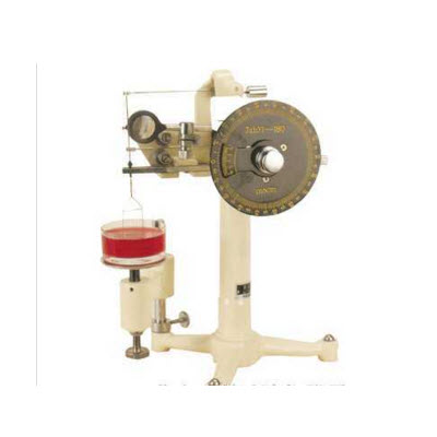 张力仪的结构,主要由扭力丝、铂金环、支架、杠杆架、蜗轮付等组成。使用时通过锅轮付的旋转对钢丝施加扭力,并使该扭力与液体表面接触的铂金环对液体的表面张力相平衡,当扭力继续增加,液面被拉破时,钢丝扭转的角度,用刻度盘上的游标指示出来,此值就是M值,用mN/m表示。*后用M值乘以校正因子F,即得液体实际表面张力值δ。