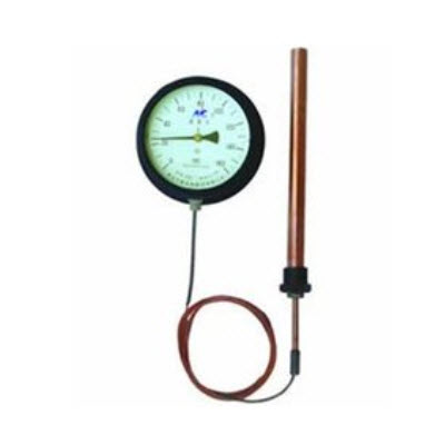 该温度计的原理是基于密闭测温系统内蒸发液体的饱和蒸气压力和温度之间的变化关系,而进行温度测量的。当温包感受到温度变化时,密闭系统内饱和蒸气产生相应的压力,引起弹性元件曲率的变化,使其自由端产生位移,再由齿轮放大机构把位移变为指示值,这种温度计具有温包体积小,反应速度快、灵敏度高、读数直观等特点,几乎集合了玻璃棒温度计、双金属温度计、气体压力温度计的所有优点,它可以制造成防震、防腐型,并且可以实现远传触点信号、热电阻信号、 0-10mA或4-20mA信号。是目前使用范围*广、性能***的一种机械式测温仪表。