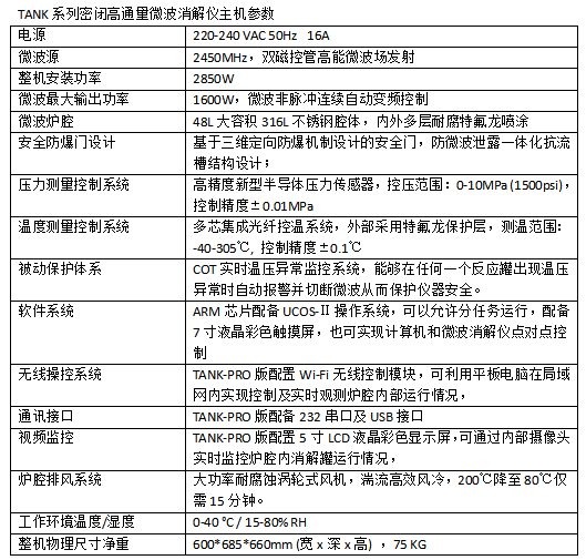 TANK的316L不锈钢工业炉腔采用整机框架式设计,实现模块化简洁化的设计理念,且为仪器的升级、维修等提供了极大的便利。炉门采用多层防护层构成,炉腔内采用多层特氟龙涂层,大大提高了仪器的使用寿命和**保障。优化的抗流槽结构设计,能够**仪器间隙造成的微波泄露隐患。开门自动断电功能,能在主动或被动开门后自动切断微波,保护使用者**。**的排风系统设计能实现快速**的风冷降温(15分钟由200℃降温**80℃),提高操作效率。