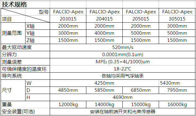 ●FALCIO-Apex 2000/3000系列为大型机使用三丰标准结构的CNC三坐标测量机,可对大重型工件进行高精度测量。在X轴测量范围为20M和30M的范围内,测量精度和驱动速度均为***高水平。